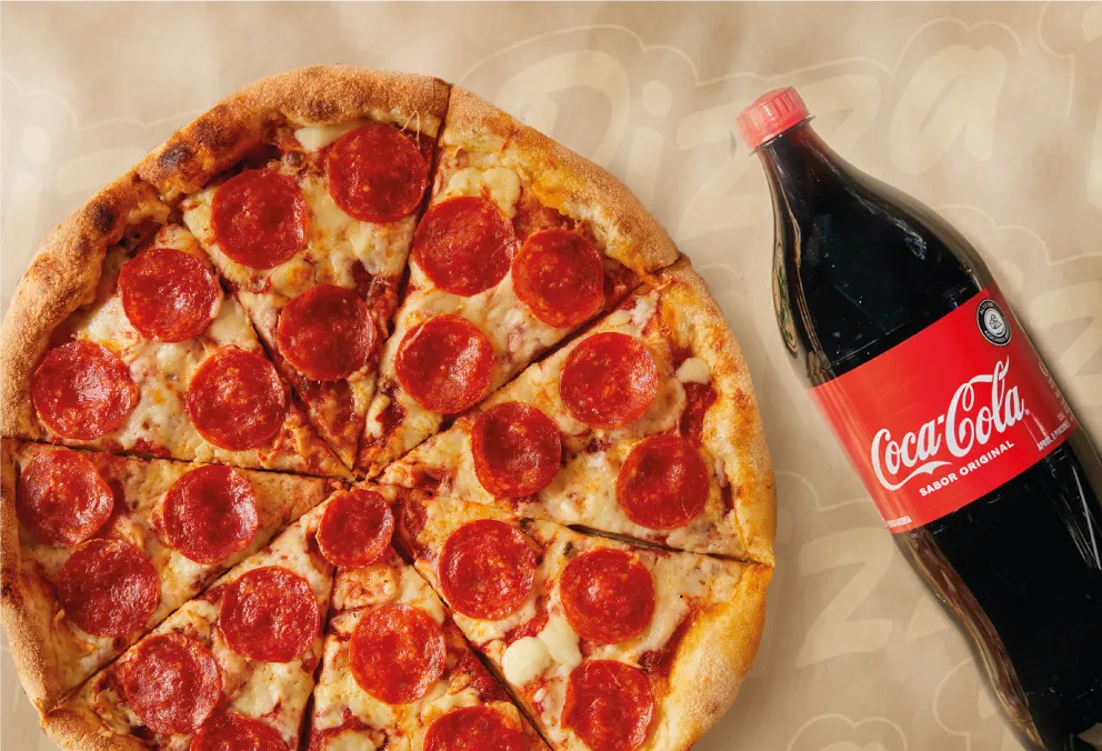 Pizza mediana artesanal (sabor a elección) acompañada de refresco gaseoso. Ideal para compartir.