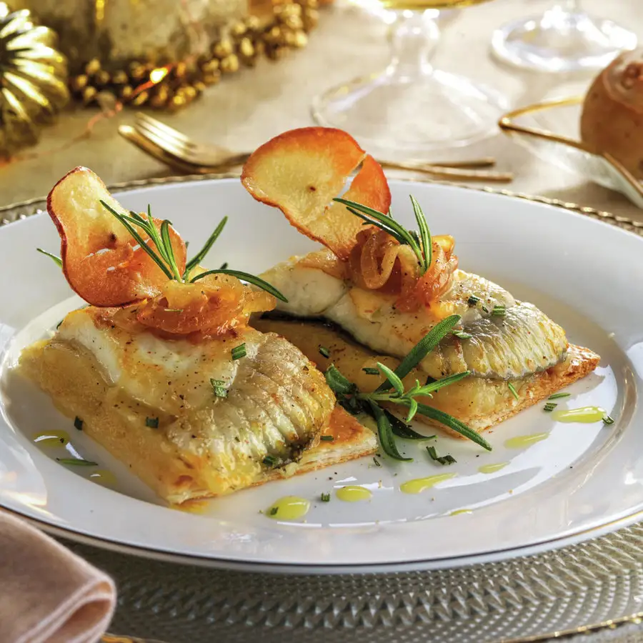 Filete de róbalo fresco a la plancha con mantequilla de limón y hierbas, acompañado de arroz y ensalada fresca.