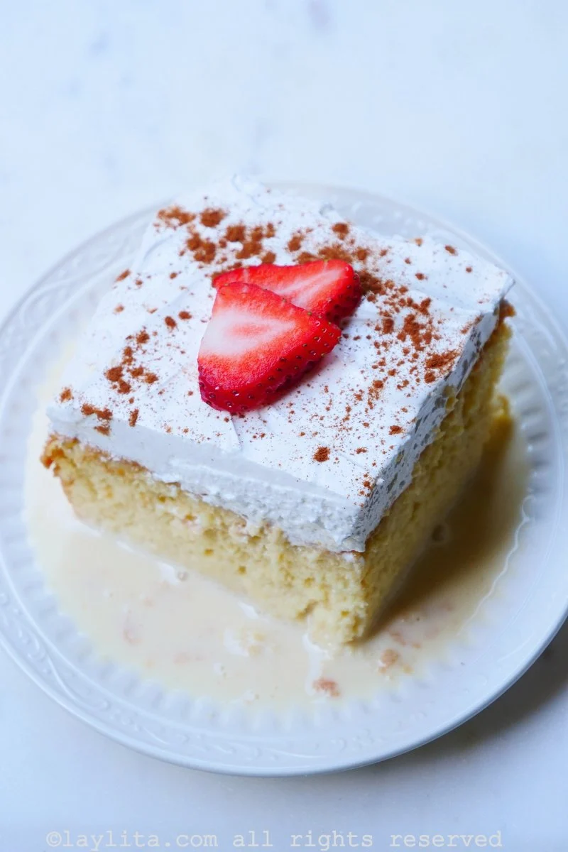 Bizcocho suave bañado en mezcla de tres leches, cubierto con crema ligera y toque de canela.